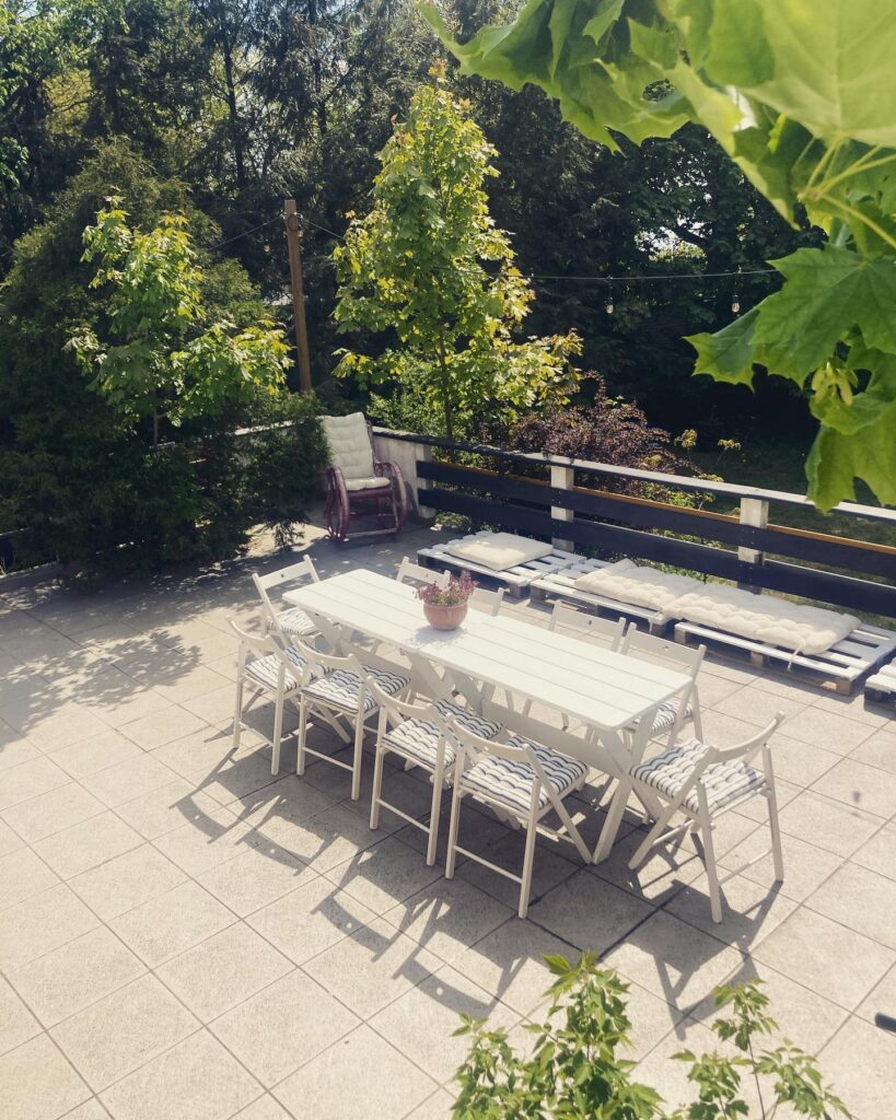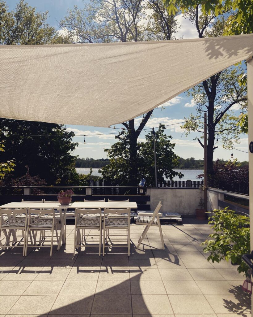 taras 50 m2 z widokiem na wodę , idealny do opalania na leżakach lub śniadania przy 10 os. stole . W nocy piękne gwiazdy oraz rechot żab gwarantowane. Latem schowany pod klimatycznymi żaglami .